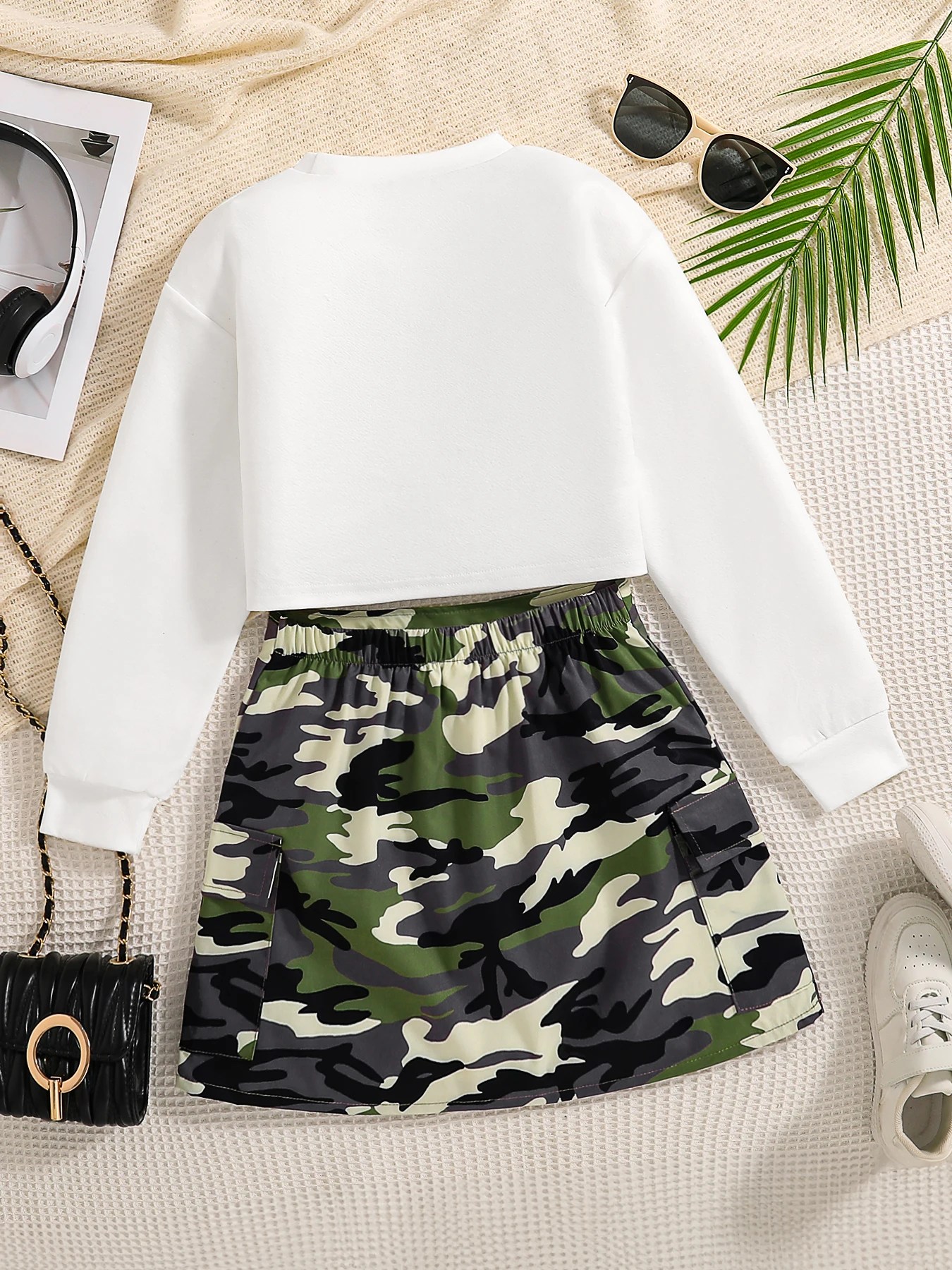 2-piece Spring and autumn girls fashion set white letter-printed knitted round neck long sleeve top + camouflage skirt set