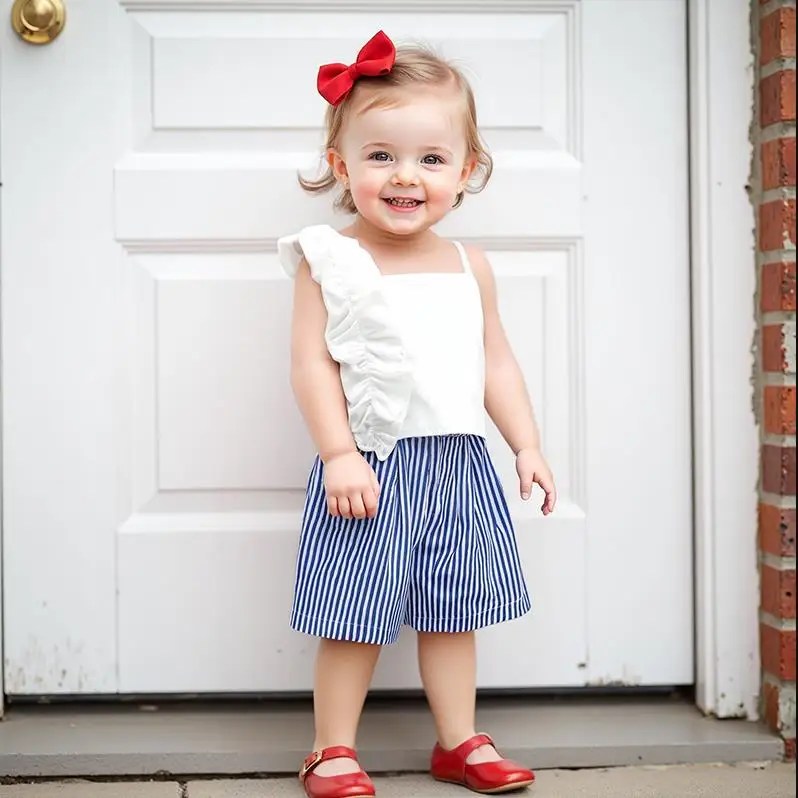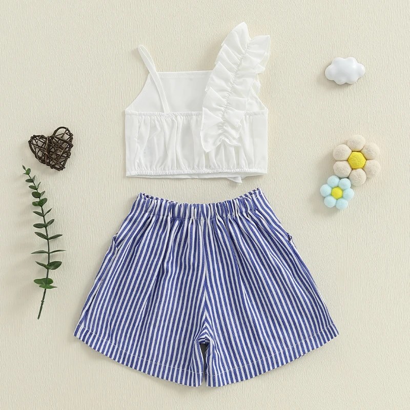 2025-01-03 Lioraitiin 0-4Y Fashion Kids Girls Clothes Set One Shoulder Frills Ruffles Camisole with Striped Shorts Summer Outfit