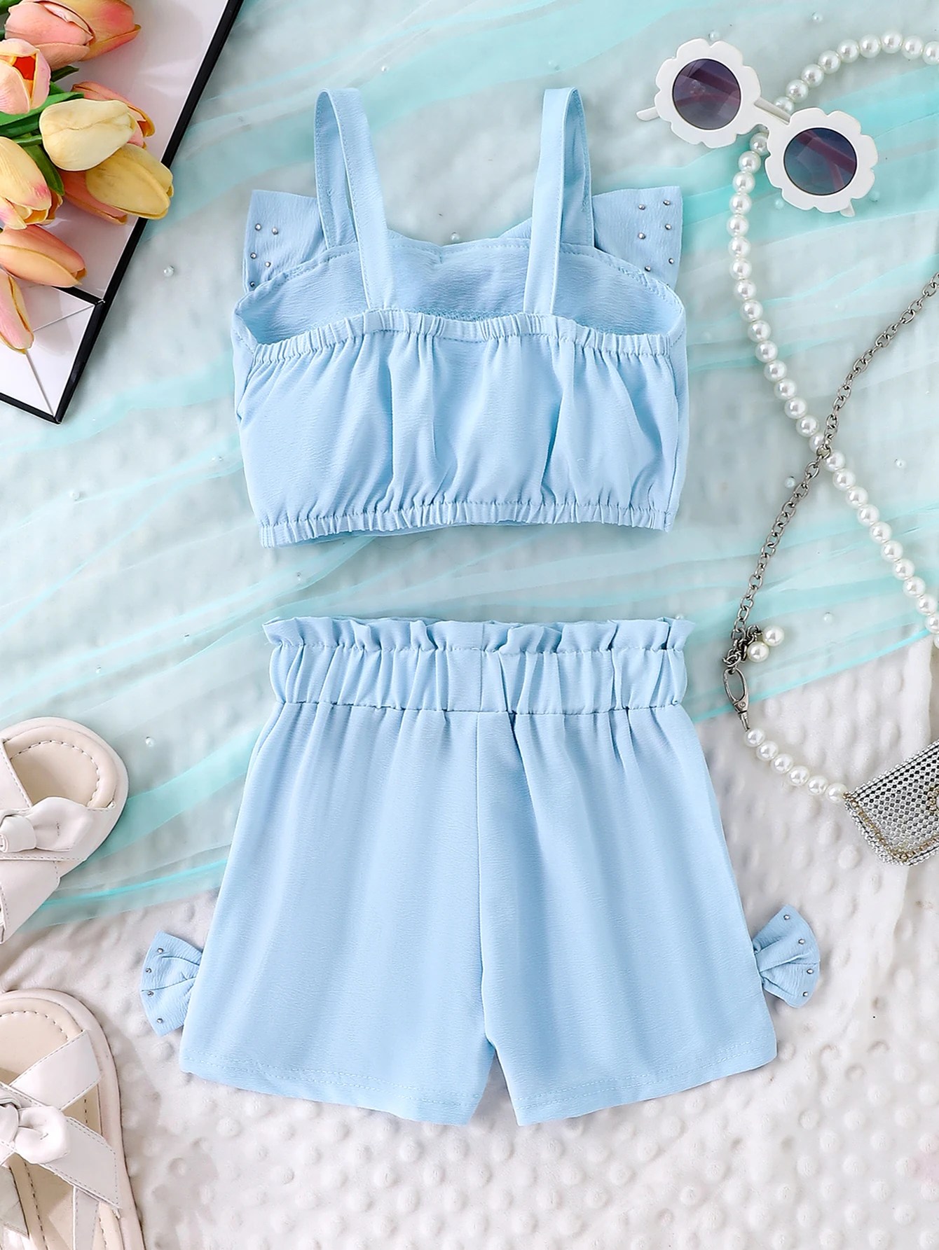 2PCS Summer New Style Girl Baby 4-7 Years Old Sweet And Cute Blue Bow Top + Shorts