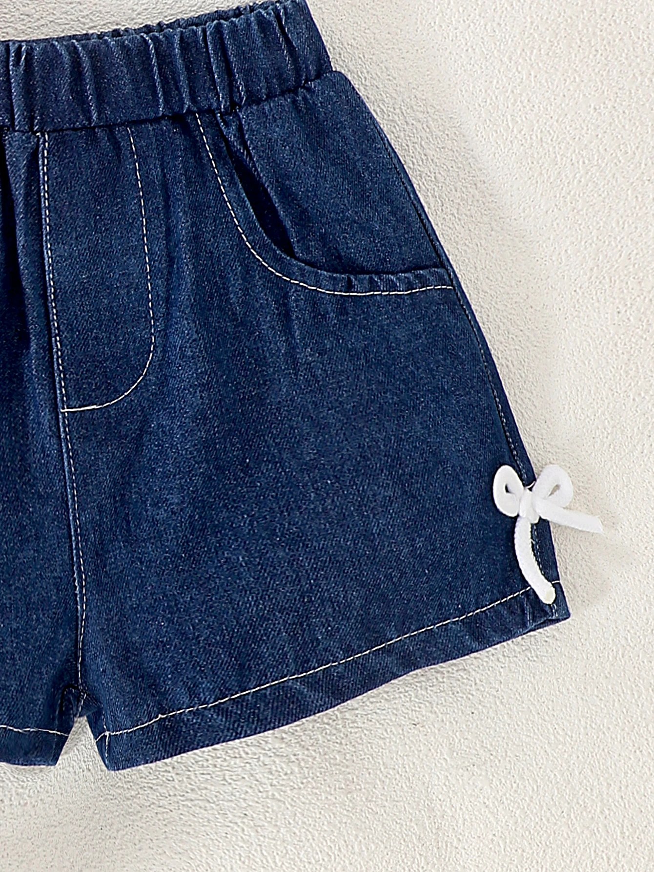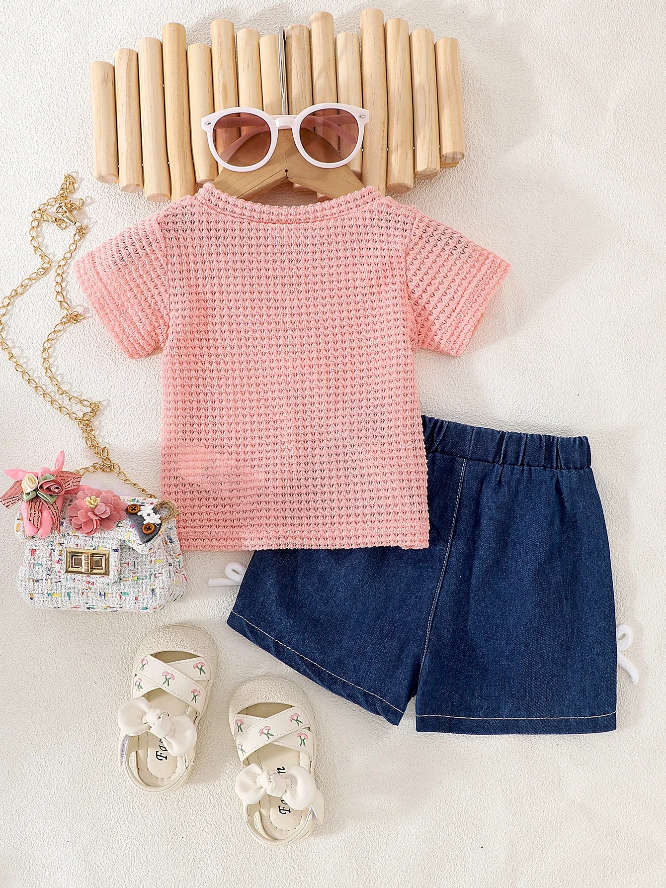 2PCS Summer New Style Girls 1-3 Years Old Sweet, Cute And Comfortable Pink Short-Sleeved Top + Denim Shorts