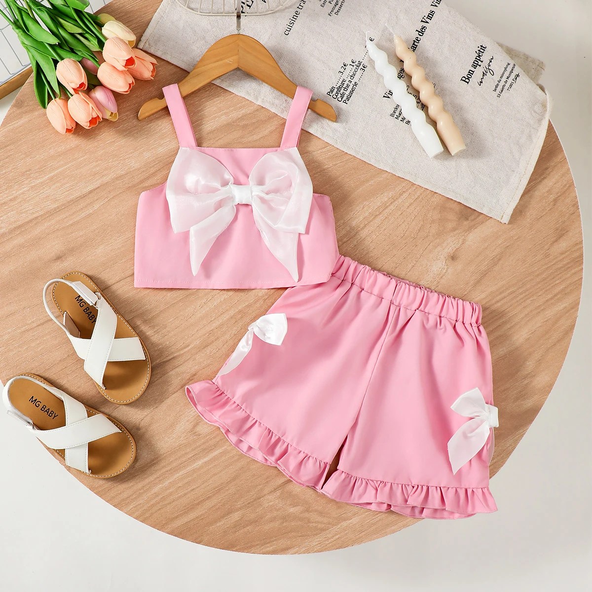 4-7 Year Kid Girls’ Fashion Set Pink Suspender Bow Top+Ruffle Edge Shorts, Summer Set, Girls’ Vacation Casual Clothing