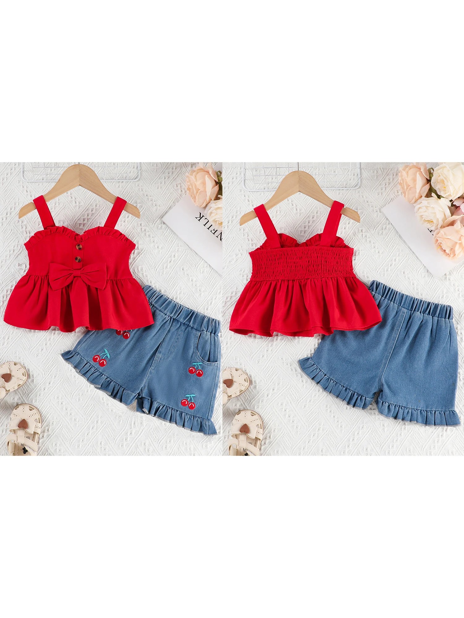 0-3 Year Old Girl Sweet And Cute Summer Style Red Collar Rice White Vest Denim Shorts Set
