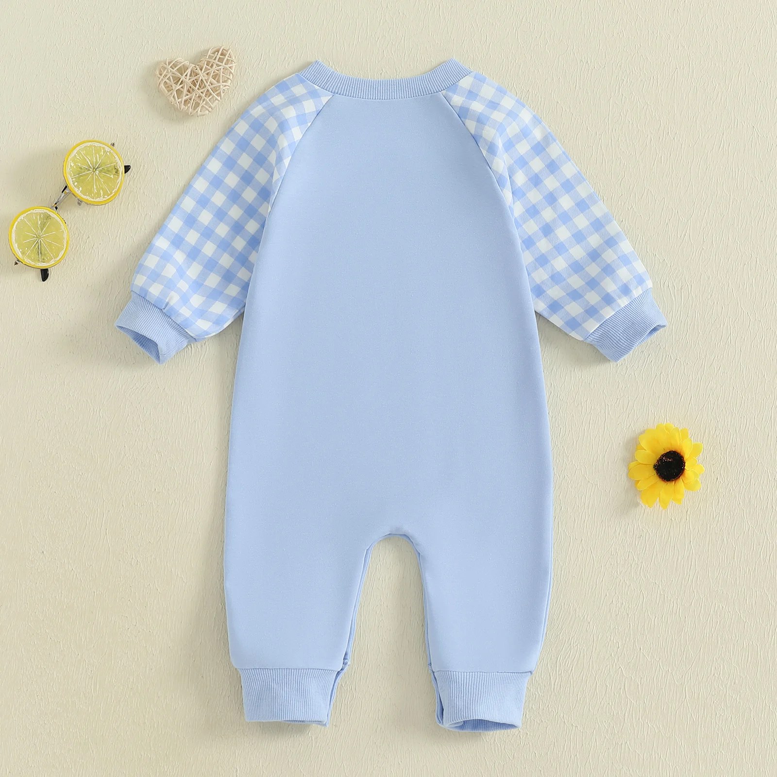 Baby Boy Fall Romper Plaid Print Letter Embroidery Long Sleeve Round Neck Full Length Jumpsuit