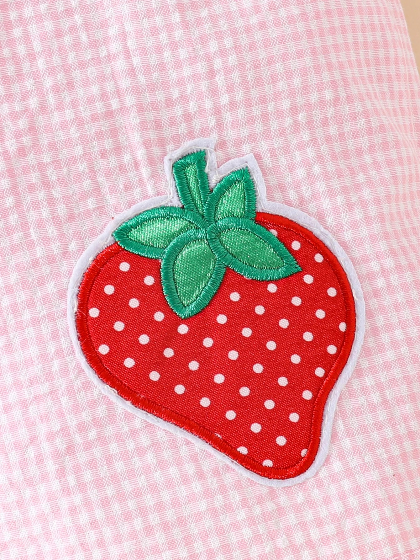 Baby Girl and Toddler Summer Playful and Cute Pink Plaid Red Polka Dot Bow Strawberry Towel Embroidered Suspender Jumpsuit + Hair Tie