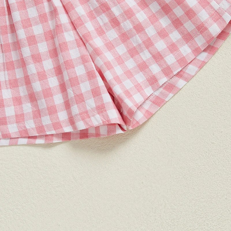 Girl set sleeveless pink checkered top with bow design and two-piece shorts set