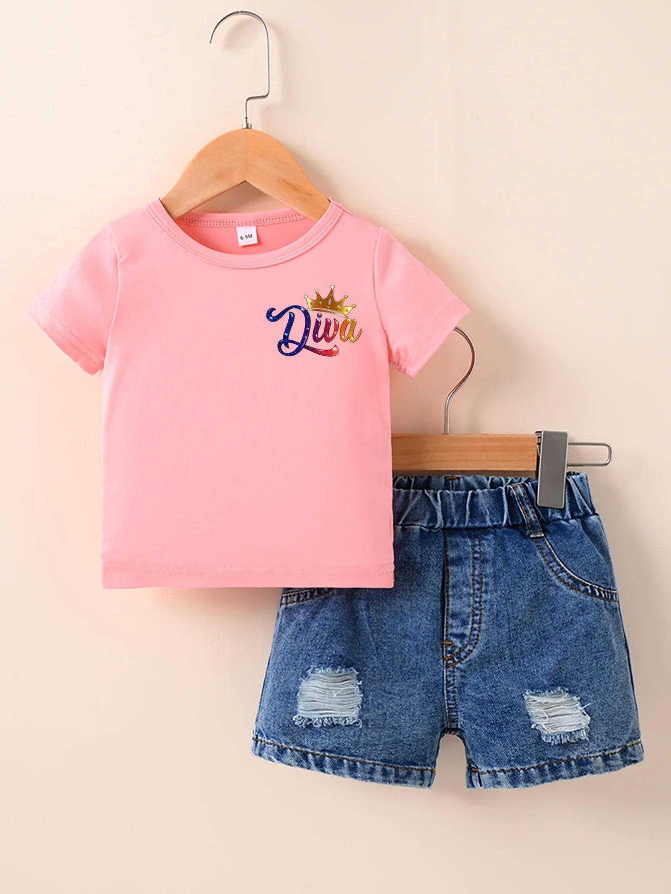 er New Boys and Girls Short sleeved Pink T-shirt Round Neck Pullover+Denim shorts set