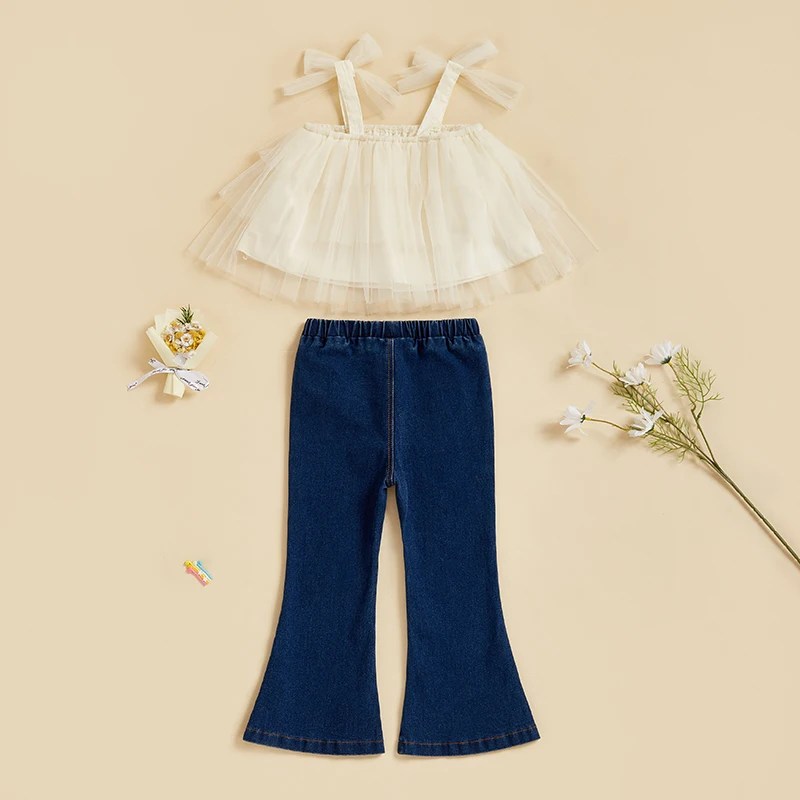 FOCUSNORM 0-4Y Fashion Kids Girls Summer Clothes Sets 2pcs Sleeveless Tie Strap Lace Tulle Tops + Denim Flare Pants