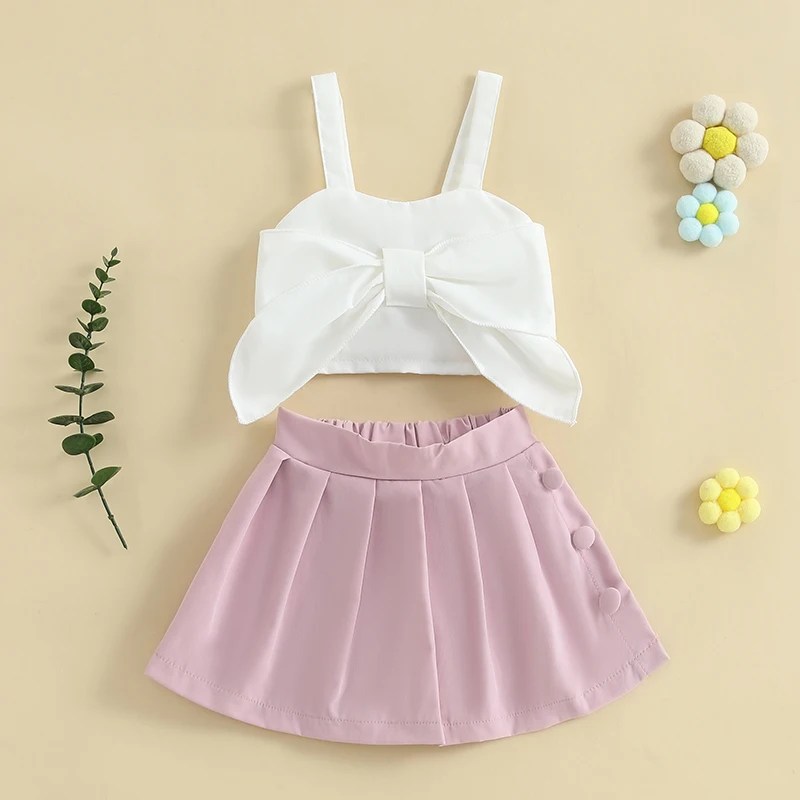 FOCUSNORM 1-5Y Fashion Kids Girls Summer Clothes Sets 2pcs Sleeveless Bow Tank Tops + Pleated Shorts Skirt