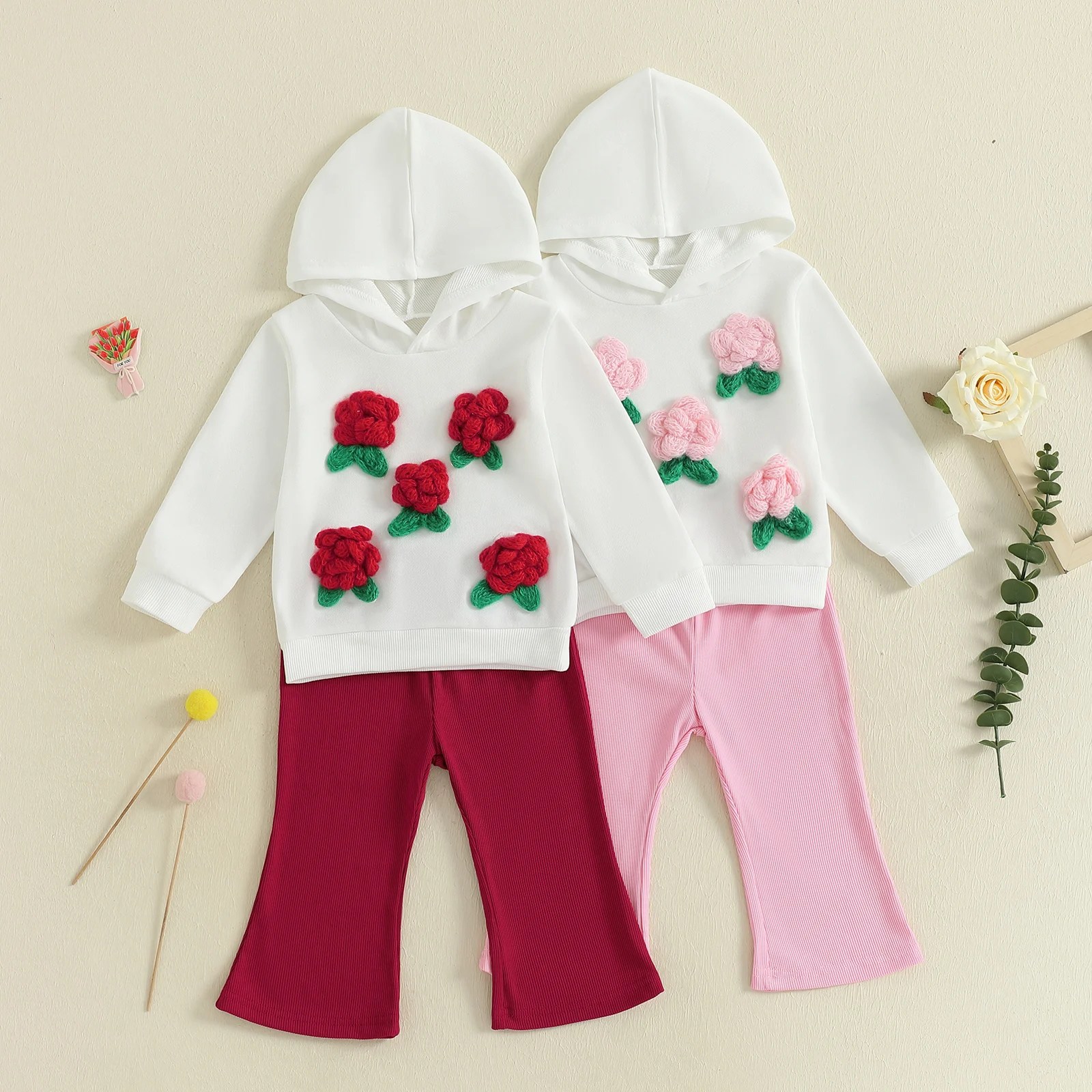 Infant Baby Girl 2Pcs Clothes Set Casual Toddler 3D Flower Long Sleeve Hoodies Elastic Waist Flare Pants Children Clothing
