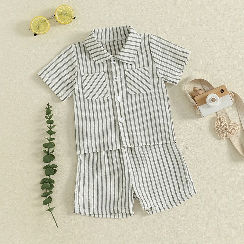 Lioraitiin Toddler Baby Boy Shorts Set Striped Collared Short Sleeve Button-up Shirts Elastic Waist Shorts Summer Clothes 2Pcs