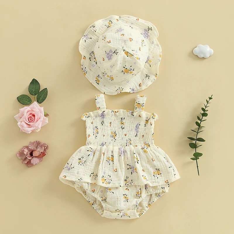 Summer Newborn Baby Clothes Infant Baby Girls Princess Romper Sleeveless Ruffle Floral Print Jumpsuit Playsuit with Sun Hat