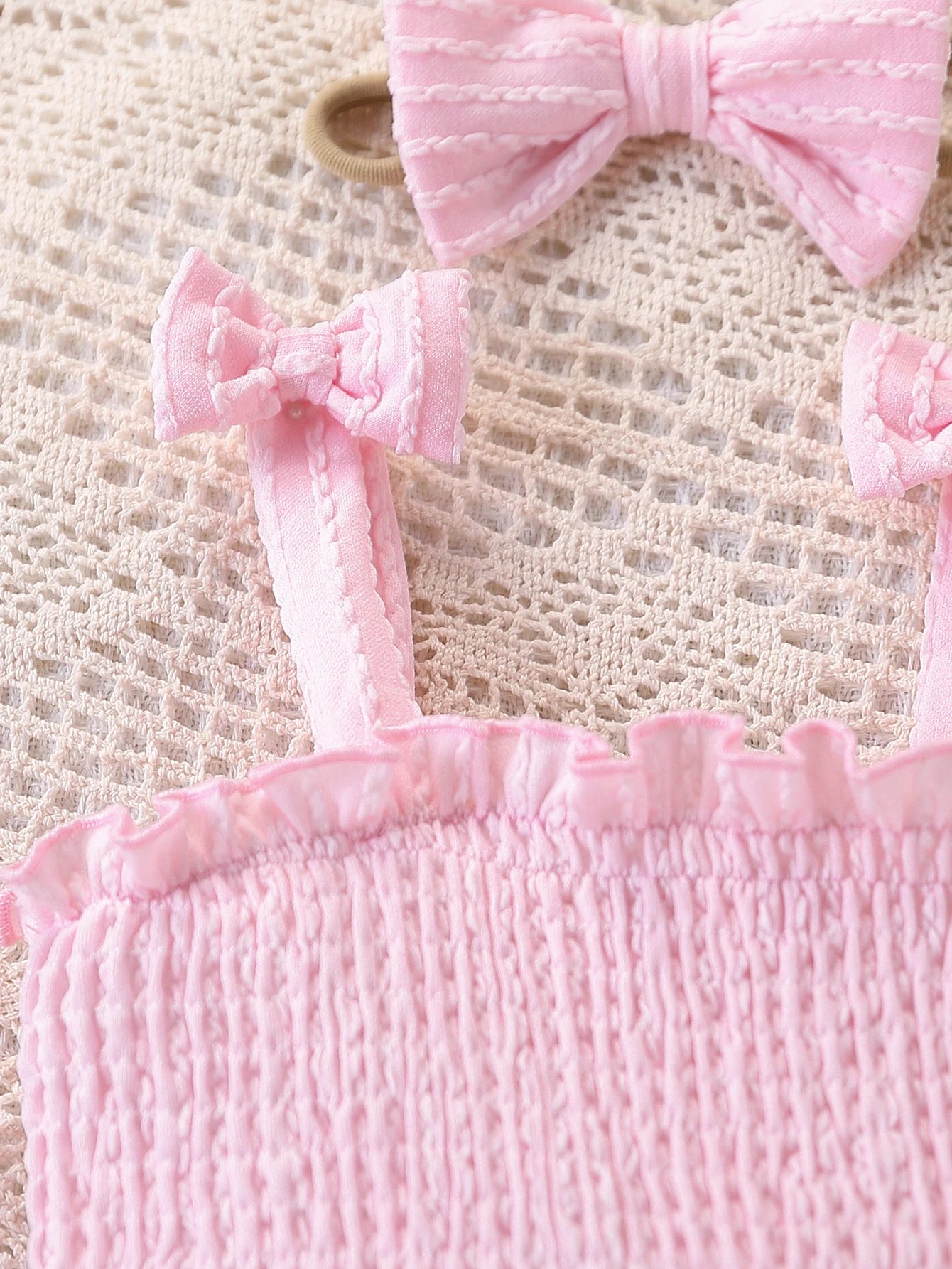 Sweet and cute baby girl with a three-dimensional bow strap and triangular casual jumpsuit (including hair accessories), summer