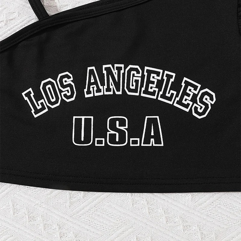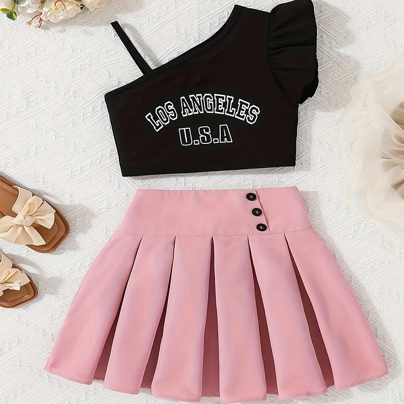 Two Piece Summer Girl Cute Single Piece Suspender With Letter Printed Petal Sleeves Dress Set, Princess Birthday Party Costume