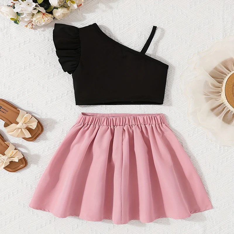 Kid Girl Summer Clothes Solid Color Frill Ruffled Camisole Asymmetric Denim Skirt 2 Pcs Set